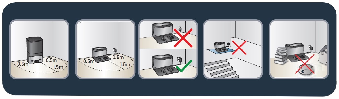 У цьому місці мають бути відсутні перешкоди (зокрема, килими). Залиште принаймні по 1,5 метру вільного простору ліворуч і праворуч, а також 2 метри перед зарядною станцією. Якщо станцію розташовано в куті або її складно знайти, робот-пилосос не зможе дістатися до неї.