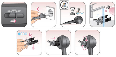 • промийте нагрівальну трубку водою та рідким засобом для миття, а потім прочистіть за допомогою спеціального приладдя.