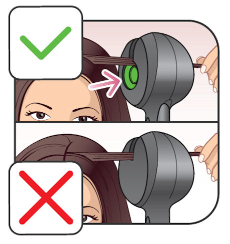 Не слід вставляти волосся й потім підносити прилад до голови. Замість цього тримайте прилад поруч із головою або на половині довжини волосся, залежно від того, який результат треба отримати: повна довжина або лише половина.
